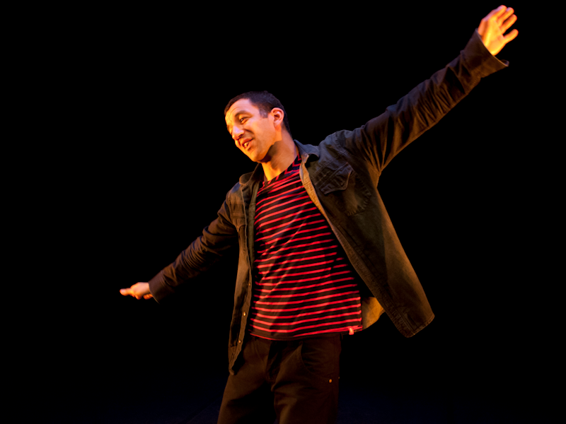 Rachid Bouali se situe à la frontière entre l’acteur et le conteur, dessinant des espaces avec son corps, passant d’un personnage à un autre avec la liberté de briser le quatrième mur à tout moment. C’est dans les contes, les mythes, mais aussi dans ses propres souvenirs d’enfance qu’il puise la matière nécessaire pour inventer et construire ses histoires.